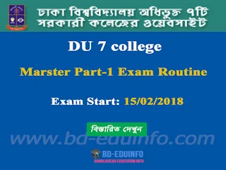 University of Dhaka Under the affiliate 7 college Masters Part-1 Exam Routine has been published. Examination 2015 Seeson is going to start 15/02/2018. This exam routine will be applicable for 2014 to 2015 (regular) and 2012-2013, 2013-2014 (Irregular) and 2013, 2015 and 2016 (Private). The Exam routine of all 7 college under college together.